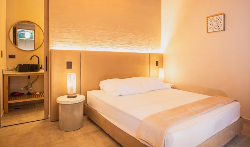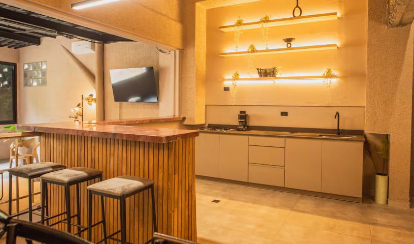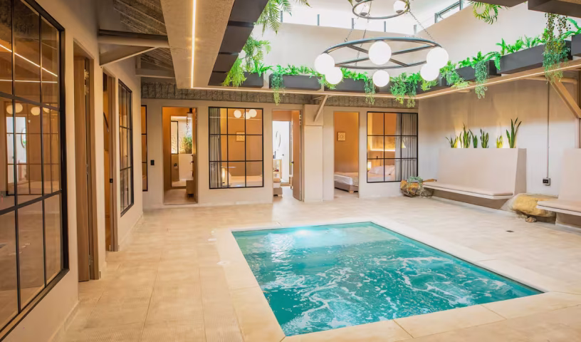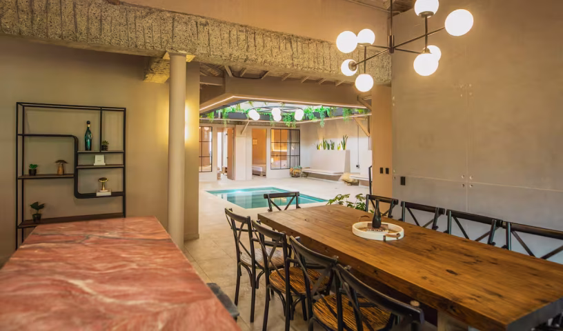 Discover Casa Atrio, a stunning luxury retreat where industrial-chic design meets natural elegance in the heart of Provenza. This architectural gem is built around a magnificent central atrium featuring a heated indoor pool with jets—the true soul of the house. Five beautifully appointed en-suite bedrooms, some opening directly to the pool area, offer a unique and intimate resort experience. The open-plan living space includes a gourmet kitchen with a statement pink marble bar, a stylish dining area, and a cozy living room. With 24/7 staff for security and cleaning, and a location steps from Medellín's finest dining, Casa Atrio is an unforgettable urban sanctuary.